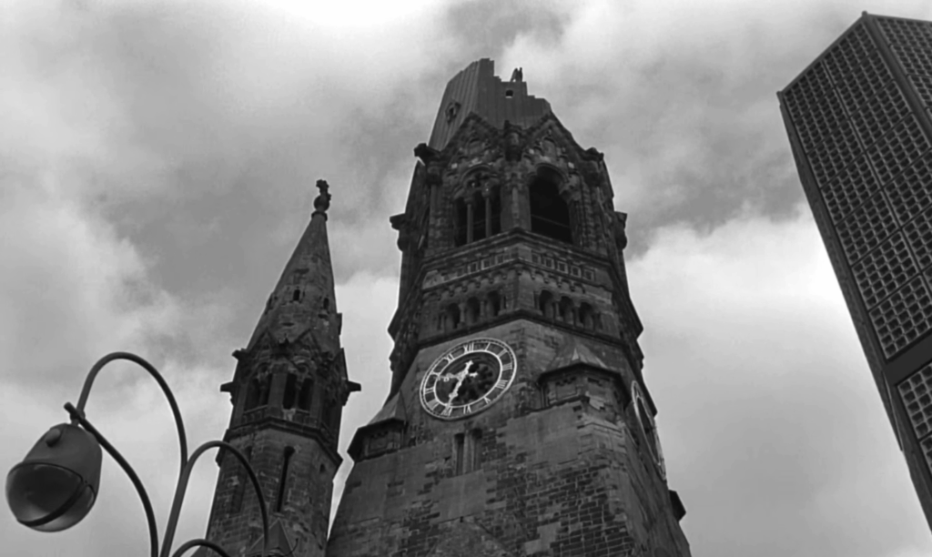 Одним из символов фильма становится Мемориальная церковь Кайзера Вильгельма – церковь-памятник на Брайтшайдплац, построенная в конце XIX века в неороманском стиле. В 1943 году храм был разрушен бомбардировками, а после войны было решено сохранить обгоревшую руину башни как напоминание о трагедии. В фильме Вендерса знаменитая руина появляется в первых сценах, на верхушке ее стоит человек с огромными крыльями ангела – образ, который стал одним из самых узнаваемых в истории кино. Сегодня полуразрушенная церковь по-прежнему возвышается над площадью, служа мемориалом и одной из самых популярных достопримечательностей Западного Берлина.