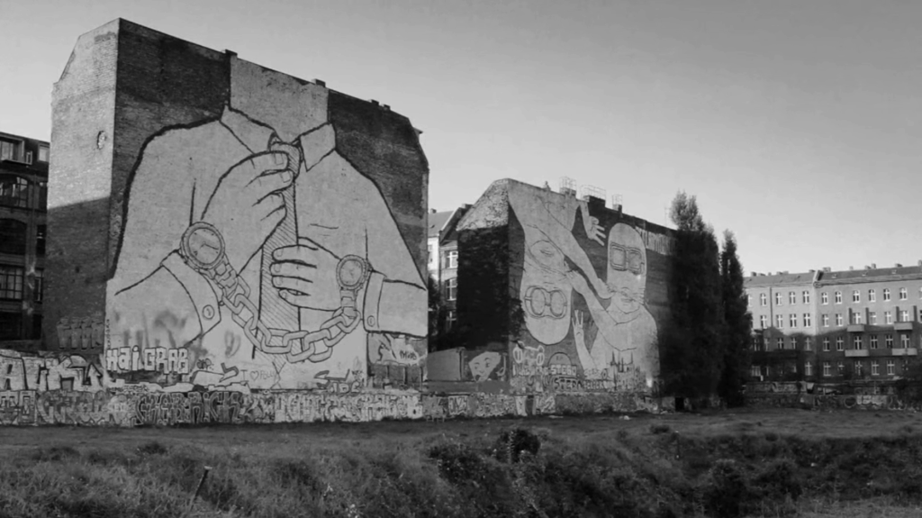В 2007-2008 годах на окраине Кройцберга, на непримечательных противопожарных стенах бывшей промзоны появились две гигантские фрески. Их создал один из самых яркий представителей арт-сцены, итальянский уличный художник Blu. Одно изображение — безголовый торс, чьи запястья скованы золотыми часами, как наручниками. Другое — две фигуры в масках, разрывающие друг другу лица, формируя руками буквы W и E — West и East.